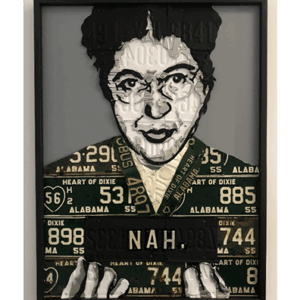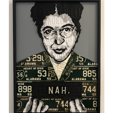 I’m a part-time artist, my full-time job is a high school social studies teacher and I’m inspired by individuals whom I teach about and who have made positive contributions to society. I use vintage license plates, those from their home states and those from significant years to tell their stories.