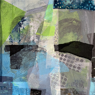 Oil & acrylic paintings on panel/canvas. Underlying textures of gesso are applied before the paint. Collage materials of designed, printed papers & fabrics are incorporated into the paintings.