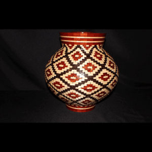 These vessels are crafted from 1 to 12 wood species, cut into strips 1/8 inch to 2 inches wide. These are sanded, segmented, and glued into patterns, with up to 2,000 segments per vessel. The vessel is then turned on a lathe to shape, sand and finish. This process takes from 3 to 10 days.
